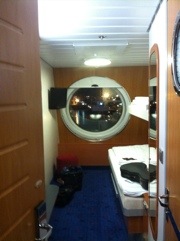 Moments ago I left England. No words could have prepared me for this experience. This is the largest ferry in the world. There are 1200 cabins, room for 500 vehicles. The elevators serve eleven decks. My cabin is like a movie set. It’s on the top deck; my porthole is centered astern. It’s four feet wide.